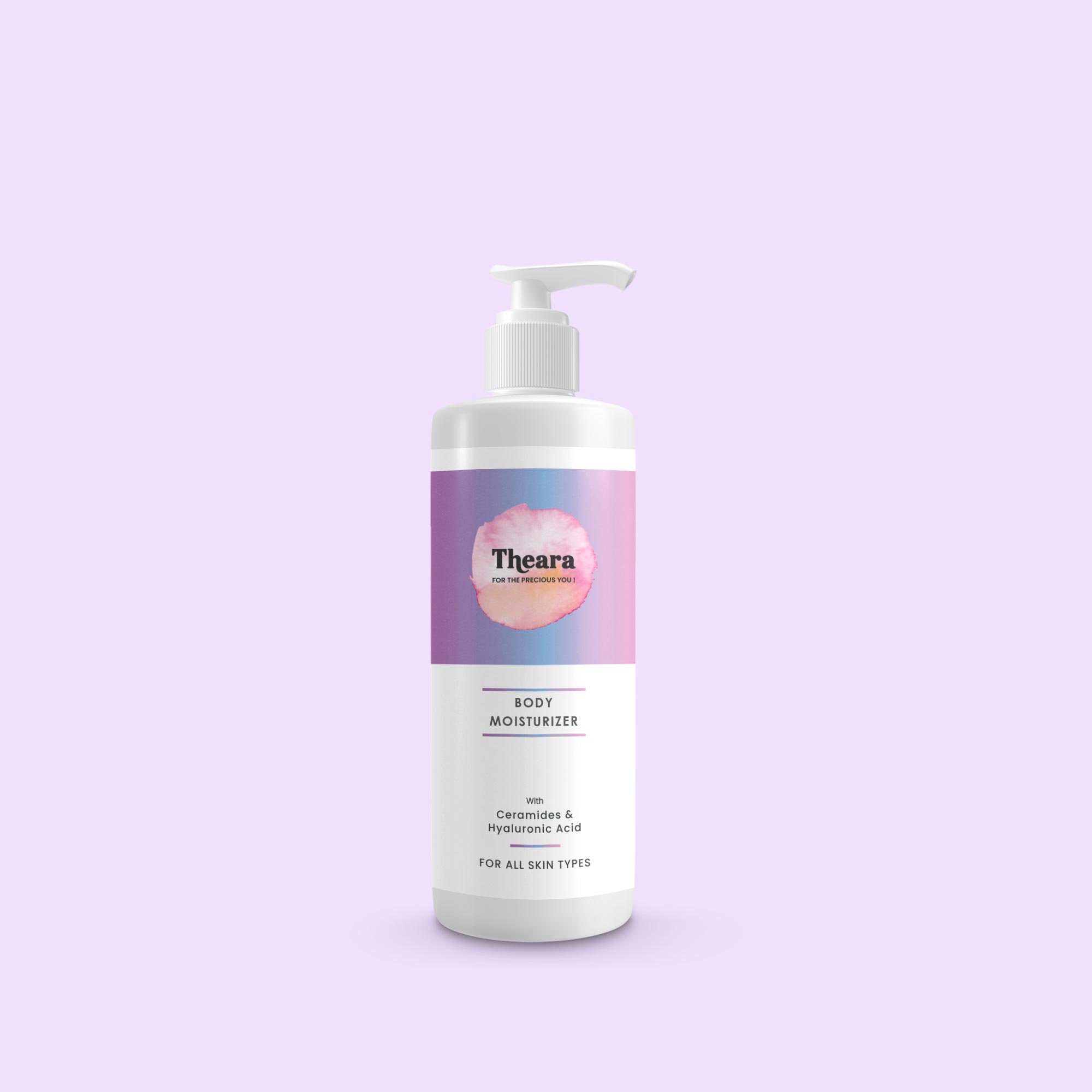 Theara Body Moisturizer is a daily hydrating solution formulated to deeply nourish, soothe, and protect your skin. Enriched with ceramides, hyaluronic acid, niacinamide, and natural butters, it locks in moisture, repairs the skin barrier, and keeps your skin feeling soft, smooth, and rejuvenated all day long. This non-greasy, fast-absorbing body lotion is suitable for all skin types, including dry, sensitive, and rough skin.